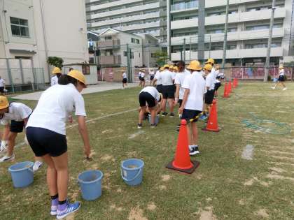 冬芝の種まきの後、その上に砂をかけ、とんぼでならしました。運動会後は養生期間で、当分、芝生の運動場は使えませんが、毎日水やりをして、子どもたちが思いっきり運動できるように作業を続けていきます。楽しみに待っていてください。