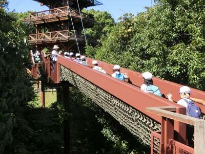 自然観察学習館を見学した後、森の空中観察路「ソラード」を通りながら景色を眺めました。その後、綺麗に咲いている花の丘「コスモス畑」を通りました。
