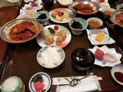 宿舎で夕食です!品数が思ったより多くて、本当に豪華でした。おいしくて大満足との声が多かったです。