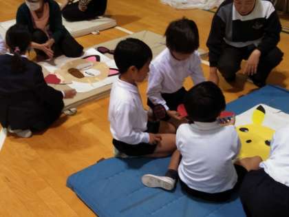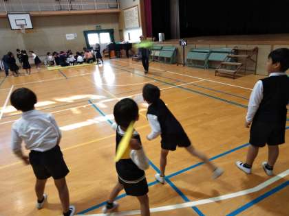 紙飛行機、将棋、はねつき、お手玉、けん玉、あやとり、コマ回し、福笑いの8つのコーナーを子どもたちは、順に遊びました。30人もの地域の方が来られ、みんなよい笑顔があふれる楽しい2時間でした。