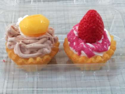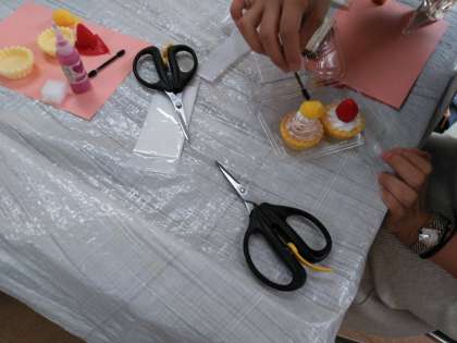 今回は、イチゴとモンブランのタルトの製作です。参加の皆さんは、タルトの焦げ目を塗ったり、シリコンの生クリームをしぼったりして、サンプルと思えない作品ができて、満足していました。乾かすのに3日かかるので、大事に持って帰りました。
