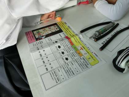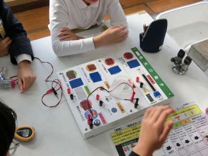 ローラーを回して、電気を起こし、豆電球とLED電球の点灯時間を調べたり、発電所の仕組みなどを学びました。3人の講師の方にわかりやすく、ていねいに電気について教えてもらいました。