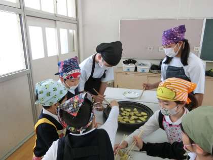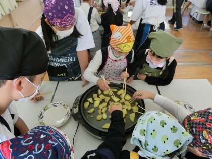 クラス別に、ホットプレートで、ゆがいたさつまいもを焼きました。塩をつけたり、バターを塗ったりして食べました。子どもたちは、とても満足した笑顔で、「おいしい」と、言っていました。職場体験に来ていた菫中学校の卒業生も手伝ってくれました。