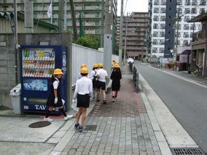 自動車も行き交うので、引率教諭が交通安全に気を付ける中頑張って