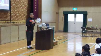 今回講師として招いたのはセレッソ大阪の元Jリーガーの森島寛晃で、1時間目には講堂で全校児童を対象とした講演会を、2時間目には同じく講堂で5・6年生を対象とした実技指導をしていただきました。