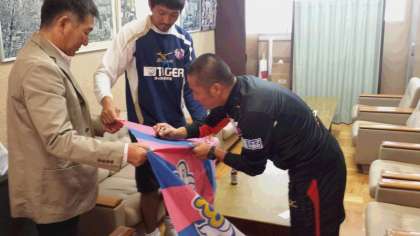 (本校が芝生化になった当時にセレッソ大阪の選手数名を招いた時に頂いた応援旗に、改めて森島・齊藤両選手に校長室でサインをしていただきました。本日、学校へ頂いたサイン色紙とともに、しばらく校長室前に飾りますので、何かの機会でご来校の際にご覧になってください)。