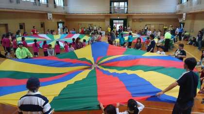 最後に講堂に集まり、参加した子どもたちを中心に、3つの大きなバルーンの綺麗な花を咲かせました。