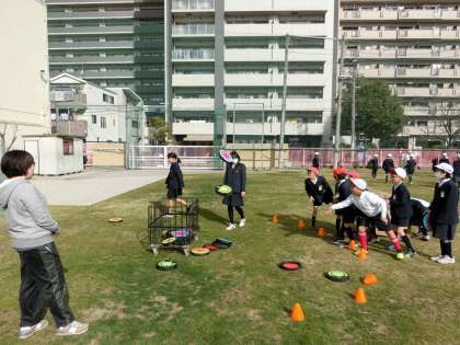 関目ランドは普段あまり使わないフリスビーやフラフープ、ラケットといった運動器具などを使って、体を動かして遊ぶ体験をしてもらうものです。この日は中学年対象でした。