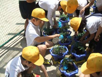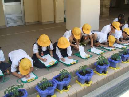 4月に植えたミニトマトの世話を毎日しています。水やりをしたり、観察カードを書いたりしています。早く花が咲けばいいなぁ(^^)/