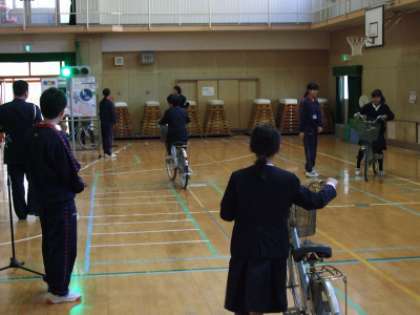 4年生は、講堂に設置された模擬道路で正しい自転車の乗り方の指導を