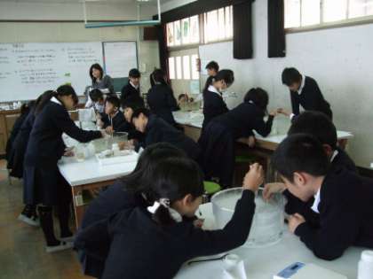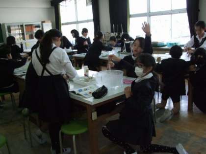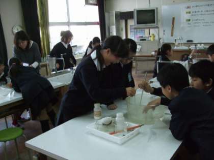 棒温度計で温度を確かめながら協力して実験をすすめていました。