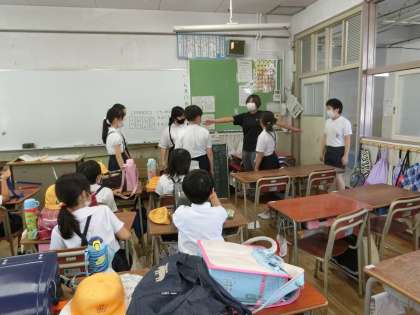 6月18日(木)から再開される集団登校に向けて、分団会議・分団下校を行いました。まずは、班長、副班長を中心に集団登校が円滑に行えるよう集合場所、集合時間の確認などを行いました。その後は、ソーシャルディスタンスを確保しながら登校できるように、並び方の練習を行いました。