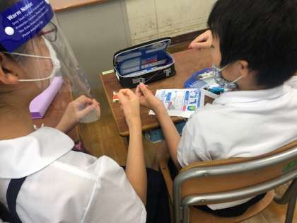 家庭科の時間に練習布を使用して、玉結び・玉どめの練習、そしてボタン付けをしました。得意な子は早く終わったので、友だちを手伝っています。