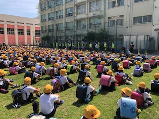 24日(水)5時限目終了後、いつも通学路で子どもたちが安全に下校できるよう見守っていただいています「地域の見守り隊」の方々との対面式がありました。