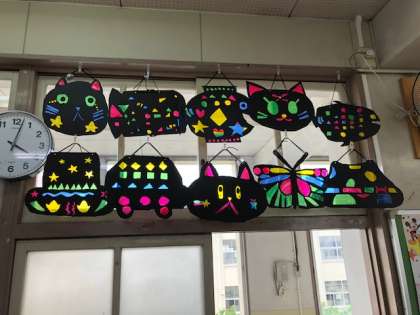 子どもたちは、自分のイメージ通りにカッターナイフが使えるように頑張っていました。切り抜いた跡には、カラーのセロハンを貼り付け、色鮮やかに装飾しました。