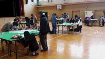 今日は朝から本校の講堂で、関目地域活動協議会第2部会(青少年指導員)主催の「関目親子たこ作り講習会」が行われました。