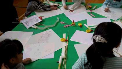今回作成するのは「土佐だこ」と言われるたこで、子どもたちが思い思いに好きな絵を台紙に描いていました(組み立て部分は保護者の方が大活躍のようでした)。