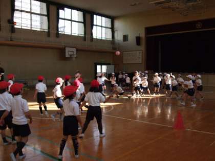 整列をして、次はドッチボールです。赤白に分かれてボールを追いかけて