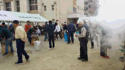 今日は朝から本校運動場で、関目地域活動協議会主催のもちつき大会が行われています。