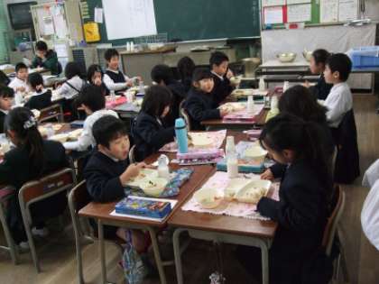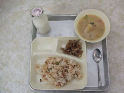きょうの献立は、正月の行事献立で、さけちらし・雑煮・焼きれんこんでした。
