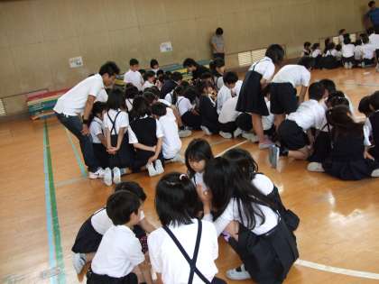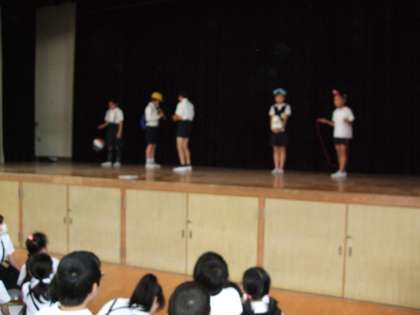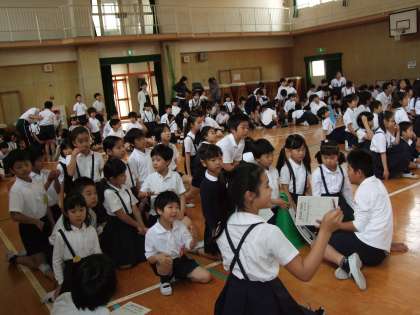 毎週木曜日に児童集会をしています。今日は、たてわり班に分かれて「まちがいさがしゲーム」をしました。集会委員が舞台の上でポーズをとります。班のみんなでしっかり記憶。一旦カーテンが閉じられ、次のポーズが現れました。「ランドセルがちがう」「ウサギの色が変わっている」違いを見つけるのに一生懸命!!8個全部の間違いを見つけた班の1年が立ってオメデトウの拍手を受けていました(^0^)