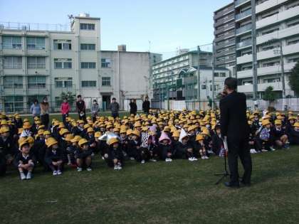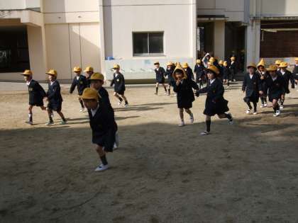 訓練放送を聞いて全校児童は、まず運動場に避難しました。