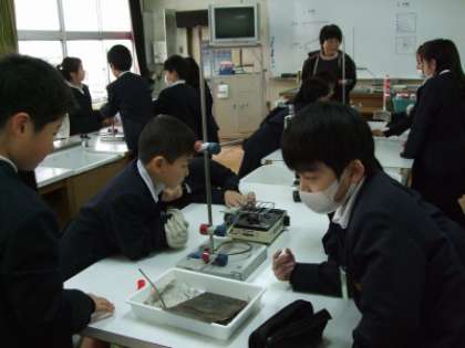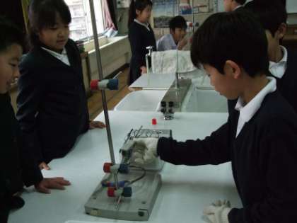 金属の棒にロウをぬり、電熱器で温めてロウの溶け方を実験していました。
