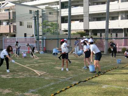 緑の芝生の運動場は、関目小学校の子どもたちの憩いの場です。