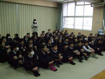4年生は、多目的室に学年全員集まって静かに聞き入っていました。