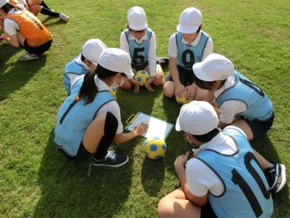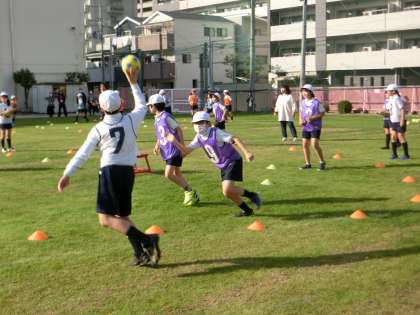 5年2組は、体育でボール運動をしました。次の学習の「ハンドボール」に向けてキャッチボールなどボールに親しみました。最後にコートの真ん中にあるコーンを当てるゲームをしました。チームで作戦を立て協力して、楽しく学習できました。