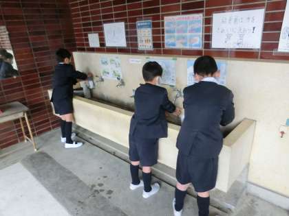 学校では、登校後、すぐに手洗いを行うよう放送する等、新型コロナウイルス感染症から自分たちの健康と安全を守ることを意識して学校生活を送ることができるよう、手洗い・手指消毒の指導を行っています。