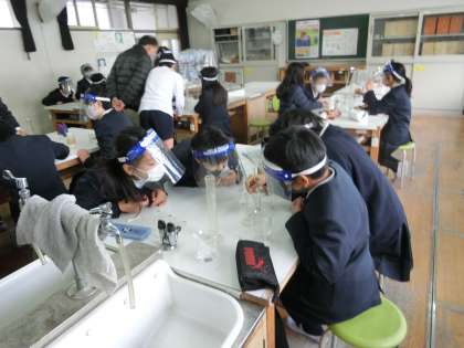 メスシリンダーで水の量を図り、水の量に対して食塩やミョウバンがどれくらい溶けるのかを確かめる実験を行いました。