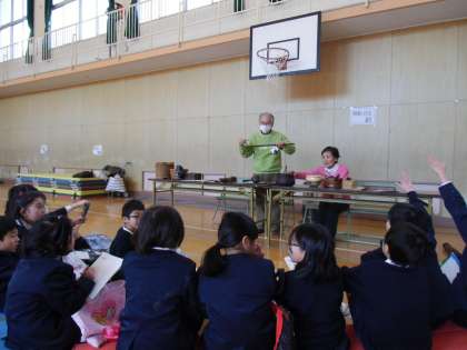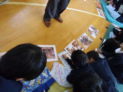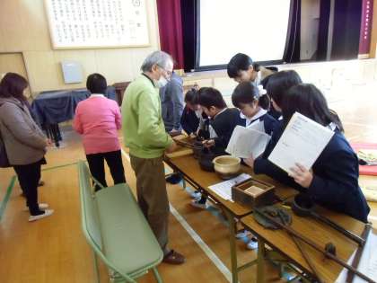 昔の学校の様子や遊びについても教えていただきました。子どもたちは昔、学校で裸足だったことにびっくり!たくさん持ってきていただいた昔の道具にも実際に触らせていただきました。