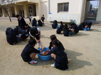 冷たい水でがんばって洗いますが、なかなか汚れがとれずうまく洗うことは難しかったようです。その後、大変だったけれども、汚れがしっかりと見えることがよかったという感想も出ました。