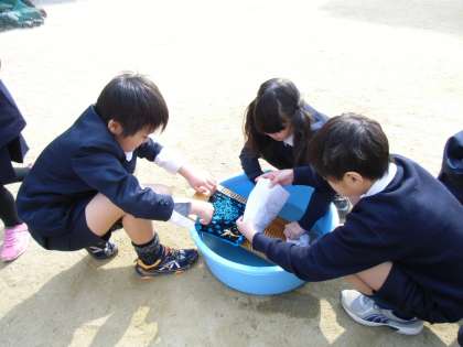 「関目の今と昔」の学習で、今日は洗たく板を使い洗たくをしました。