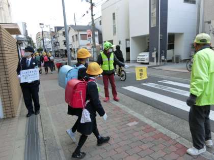 毎日、児童の下校時の見守りを地域見守り隊の方々がしてくださっていますが、今日は城東警察の方も一緒に下校指導を行ってくれました。児童もとても元気な声であいさつをしながら下校することができました。
