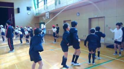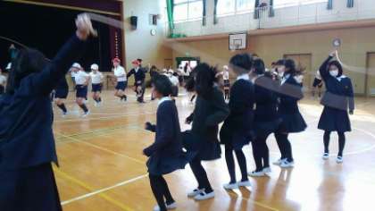 ルールは、1人で10回とべたら10点ですが、10人で1回とべても10点と計算します。今日の高学年の部では、少ないチームで2人、多いチームは10人ぐらいで1つのなわをとんでいました。中でも、低学年の時から高得点を稼いでいる強豪チームは、メンバーを増員しながら更に高得点を目指していい汗をかいていました。