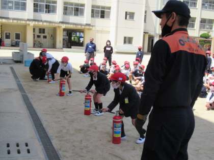 消防士さんから、消火器の使い方を教わり、各クラスから5名の代表が前に出て、実際に消火器を使わせていただきました。