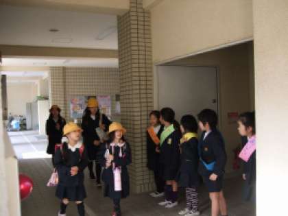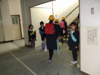 階段前で登校してくる友達に「おはようございます」と声掛けをしています。