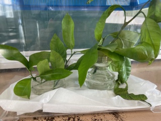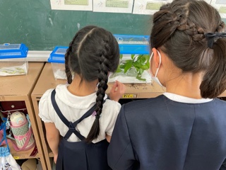 教室で、モンシロチョウとアゲハチョウの幼虫を育て、毎日観察しています。
