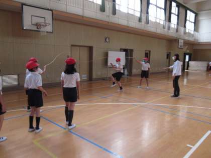 大縄跳びをしました。ソーシャルディスタンスを保ちながらでき、チームの協力が必要とされる運動なので、この時期にピッタリだと思います。