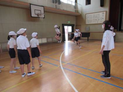 苦手な友だちに、みんなでタイミングをアドバイスする等、協力している姿が見られました。みんなで一緒に頑張った分、飛べた時には全員で大喜びして、とても楽しんでいるようでした。