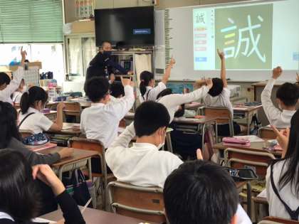 プロジェクターを使って、いつでも書き順が確認できるように工夫されていました。また、指で空書きなどをして、みんなでしっかりと学びました。