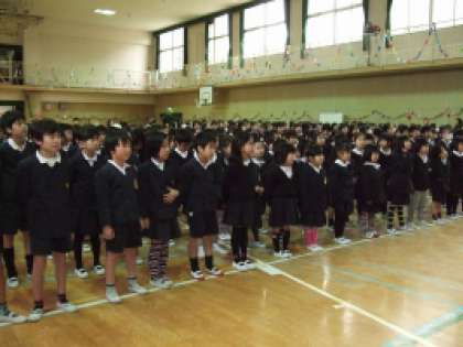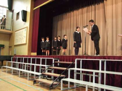 講堂で児童朝会を行いました。きょうも図工展の表彰がありました。