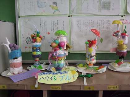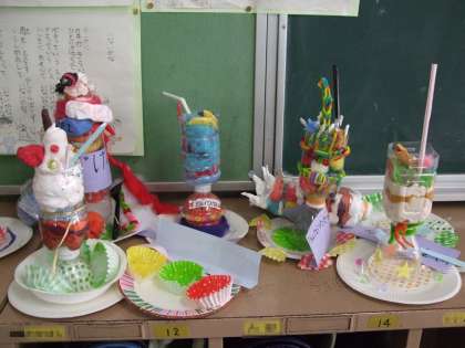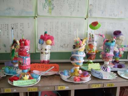 紙粘土やリボン・ボタン・スパンコールなどを使って、「おしゃれなパフェ」