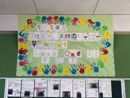 6年生では、進級してすぐ、クラスの仲間と学級目標を考えてきました。それぞれが、どんなクラスにしていきたいのかを意見し、何度も何度も話し合いながら、全員が納得のできる目標を作り上げました。4月には決まっていたのですが、登校時刻の変更もあり、時間がかかりましたが、ようやく一つの形にすることができました。