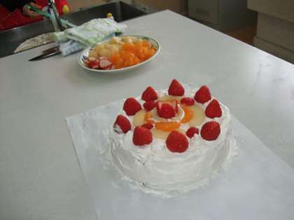 班で相談して果物を飾っていきます。班によっては、スポンジケーキを