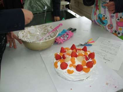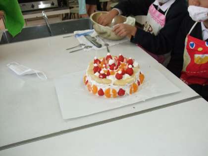 でき上がったデコレーションケーキにみんな満足で、おいしくいただいて