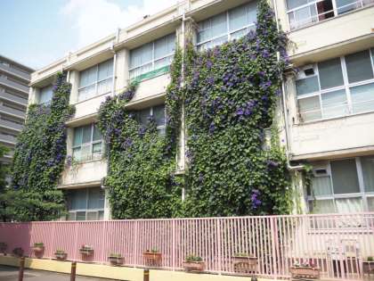 校舎の1階から3階まで大きな花、大きな葉の琉球アサガオが広がっています。