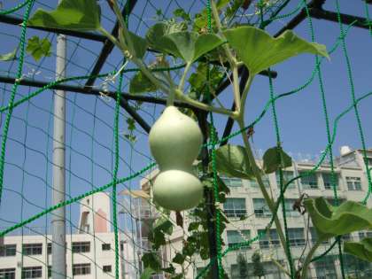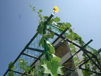 ヘチマとヒョウタンがぐんぐんとつるを伸ばしています。